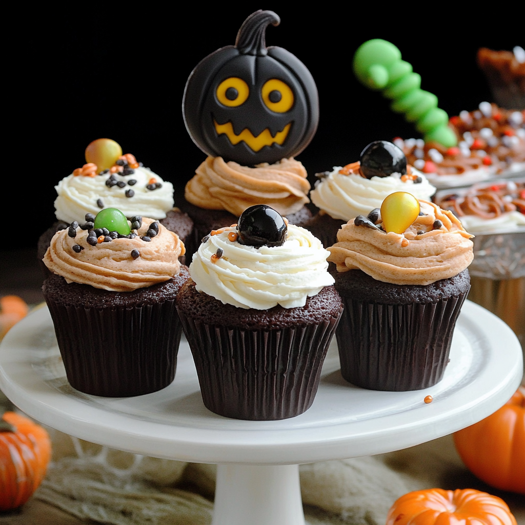 Arrange the cupcakes on a large, colorful tray or tiered stand to create an eye-catching centerpiece. Surround the cupcakes with bowls of toppings, and consider using spooky decorations like mini pumpkins or fake spider webs to enhance the Halloween vibe!